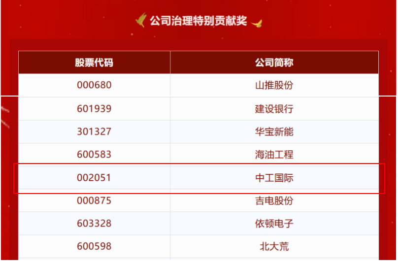 近日,第二十届中国上市公司董事会“金圆桌奖”正式发布,中工国际(002051)过去一年在公司治理、改革发展、ESG管理等方面的持续优秀表现再次得到市场认可,连续第四年荣获公司治理特别贡献奖。这项荣誉的取得体现了资本市场对中工国际公司治理工作的充分肯定。